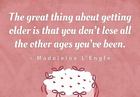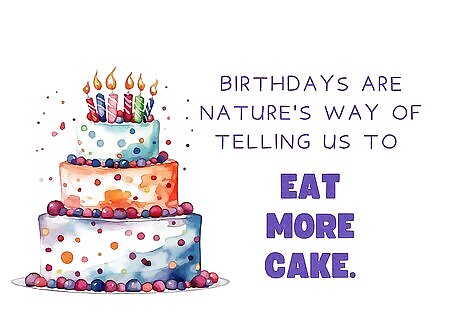 Joke about aging to make the birthday boy or girl laugh out loud. Trying to add a touch of humor to your birthday wish? Throw out a silly quote about getting older to lighten the mood! Studies show that humor can strengthen relationships. So, here are some hilarious (yet inspirational) quotes to kick off the celebrations: “The first hundred years are the hardest.” — Wilson Mizner “Time flies like an arrow. Fruit flies like a banana.” — Groucho Marx “With mirth and laughter, let old wrinkles come.” — William Shakespeare “The older you get the better you get, unless you are a banana.” — Betty White “Birthdays are nature's way of telling us to eat more cake.” — Edward Morykwas “You are only young once, but you can stay immature indefinitely.” — Ogden Nash “Men are like wine. Some turn to vinegar, but the best improve with age.” — Pope John XXIII “Age is strictly a case of mind over matter. If you don’t mind, it doesn’t matter.” — Jack Benny “The secret of staying young is to live honestly, eat slowly, and lie about your age.” — Lucille Ball “You can live to be a hundred if you give up all the things that make you want to live to be a hundred.” — Woody Allen