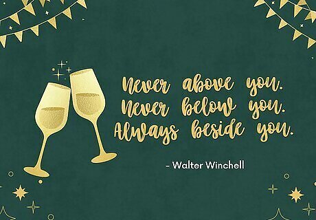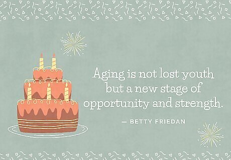 Share an inspiring quote to remind them that aging is a privilege. A lot can happen in a single year, let alone 50 years, so take the opportunity to celebrate the beautiful gift of life. Here are some inspirational quotes to remind the birthday boy or girl that they should be proud of making it this far! “It’s sad to grow old, but nice to ripen.” — Brigitte Bardot “Let us respect gray hairs, especially our own.” — J. P. Sears “You only live once, but if you do it right once is enough.” ― Mae West “Happiness is not a goal... It’s a by-product of a life well-lived.” — Eleanor Roosevelt “Aging is not lost youth but a new stage of opportunity and strength.” — Betty Friedan “We grow neither better nor worse as we get old, but more like ourselves.” — Bernard Baruch “Nature gives you the face you have at twenty, but it's up to you to merit the face you have at fifty.” — Coco Chanel “You don’t stop laughing because you grow old. You grow old because you stop laughing.” — George Bernard Shaw “Our wrinkles are our medals of the passage of life. They are what we have been through and who we want to be.” — Lauren Hutton “Do not grow old, no matter how long you live. Never cease to stand like curious children before the great mystery into which we were born.” — Albert Einstein