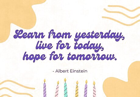 Send a simple and inspiring quote to share your well-wishes. Whether you’re writing a card, sending a text, or saying your wish in person, it’s easy to make the birthday boy or girl feel special on their big day. Just send an inspirational quote to let them know you’re thinking about them and that they can accomplish anything in their new personal year: “Youth has no age.” — Pablo Picasso “You don’t get older, you get better." — Shirley Bassey “Every birthday is a gift. Every day is a gift.” — Aretha Franklin “We turn not older with years, but newer every day.” — Emily Dickinson “Every year on your birthday, you get a chance to start new.” — Billy Mills “Don’t just count your years, make your years count.” — George Meredith “Learn from yesterday, live for today, hope for tomorrow.” — Albert Einstein “The best birthdays of all are those that haven’t arrived yet.” — Robert Orben “How old would you be if you didn't know how old you are?” — Satchel Paige “You are never too old to set another goal or to dream a new dream.” — Les Brown “Birthdays come but once a year, celebrate and be of good cheer.” — Robert Rivers “From our birthday, until we die, is but the winking of an eye.” — William Butler Yeats