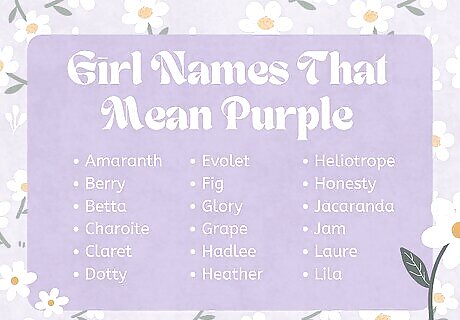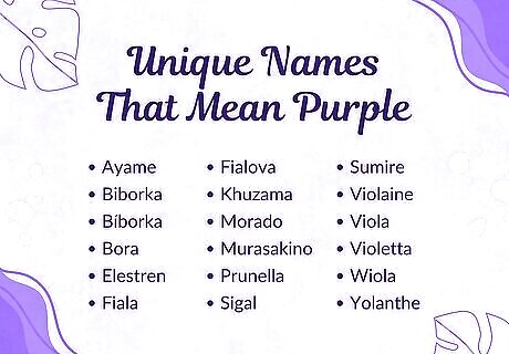 Honor another culture (or celebrate your own) with a unique name. Every culture has its own word for purple, and using one is a beautiful way to celebrate your family’s heritage (or pay respect to a culture you admire). Below, you’ll find direct translations for the color purple in different languages: Ayame - Japanese name meaning “iris.” Biborka - Hungarian name meaning “purple.” Bíborka - Hungarian name meaning “purple.” Bora - Korean name meaning “purple.” Elestren - Cornish name meaning “iris.” Fiala - Czech and Slavic name meaning “violet.” Fialova - Czech name meaning “violet.” Khuzama - Arabic name meaning “lavender.” Morado - Spanish and Portuguese name meaning “deep violet.” Murasakino - Japanese name meaning “purple.” Prunella - French name meaning “color of a plum.” Sigal - Jewish name meaning “violet” or “treasure.” Sumire - Japanese name meaning “violet” or “violet flower.” Violaine - Latin name meaning “purple.” Viola - Scandinavian and Latin name meaning “violet.” Violetta - Italian name meaning “purple” or “flower.” Wiola - Polish name meaning “violet.” Yolanthe - Greek name meaning “purple flower,” “violet,” or “violet person.”