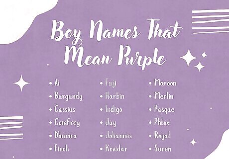 Select an edgy, bold, purple-related name for your baby boy. Traditionally, purple signifies royalty and creativity, making it a great name inspiration for your baby boy. Here are some unique names that are connected to purple elements, tones, and symbolism: Ai - Japanese name meaning “indigo.” Burgundy - French name meaning “a shade of purple” or “dark red.” Cassius - Latin name meaning “vain;” also the name of a purple pigment. Cobalt - German name meaning “goblin;” also the chemical element used to make violet pigment. Comfrey - Latin name meaning “to join together.” Corcran - Irish name that comes from the word corsair, meaning “purple.” Cosmos - Greek name meaning “likes order;” also the name of a purple flower. Dhumra - Indian name meaning “smoke colored” or “purple and gray.” Finch - English name meaning “small bird.” Fuji - Japanese name meaning “wisteria.” Harbin - German name meaning “little warrior.” Indigo - Greek name meaning “dark blue.” Jay - Hebrew and English name meaning “supplanter.” Johannes - Hebrew name meaning “God’s grace.” Kovidar - Sanskrit name meaning “purple orchid tree.” Maroon - Arabic name meaning “a brown crimson color.” Martin - English name meaning “warrior or Mars.” Merlin - Celtic, Anglo-Saxon, and Welsh name meaning “sea,” “falcon,” and “sea hill.” Mulberry - Latin name meaning “mulberry tree.” Pasque - Cornish and Middle English name meaning “Easter.” Pfeiffer - German name meaning “whistler” or “pipe player.” Phlox - Greek flower name that means “flame.” Phoenix - Greek name meaning “mystical bird” or “dark red.” Prince - Latin name meaning “royal son.” Provence - French name of a city famous for its lavender fields. Regem - Biblical name meaning “purple” or “that stones or is stoned.” Royal - Old French name meaning “regal one.” Shion - Japanese name meaning “aster,” a type of light purple flower. Shiryu - Japanese name meaning “purple dragon.” Suren - Persian name meaning “strong” or “the heroic one.” Tyrian - A purple dye used by Ancient Phoenicians. Ube - German name meaning “practice;” also the name for purple yams.