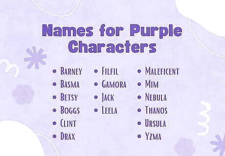 Turn to your favorite purple character for a quick and easy name. Barney, Leela, and Maleficent are just some of the iconic purple characters in film and TV! Here are more characters for inspiration, whether you’re naming your child, a character, or a plushie: Barney (Barney & Friends) Basma (Sesame Street) Betsy (Marvel Comics) Boggs (Monsters, Inc.) Clint (Hawkeye in the Marvel Comics) Drax (DC Comics) Filfil (The Muppets) Gamora (Guardians of the Galaxy) Jack (DC Comics) Leela (Futurama) Maleficent (Sleeping Beauty) Mim (The Sword and the Stone) Nebula (Guardians of the Galaxy) Thanos (Marvel Comics) Ursula (The Little Mermaid) Yzma (The Emperor’s New Groove)