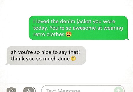 A compliment is a great way to break the ice. You can say something about what they wore or how much you enjoyed talking to them. Compliments are never overrated, and you don't have to see the person face to face to give a meaningful compliment. A small compliment can be a great way to start a conversation and to make the person feel like you really care. As long as you're being genuine and not making the person feel uncomfortable, this is a great way to chat over the phone. Here are some great things you can say to compliment a person over text: "You were amazing in your basketball game yesterday. I was so impressed." "I loved the denim jacket you wore today. You're so awesome at wearing retro clothes." "Thanks for helping me study for the math test last night. You're such a good friend and I couldn't have aced it without you." Keep the compliment short and don't carry on with it for several texts because that's creepy. Reader Poll: We asked 385 wikiHow readers and 56% of them agreed that their favorite type of compliments to receive are ones about their character or personality. [Take Poll] So try something related to who they are on the inside, like “I really admire your ambition” or “You’re so thoughtful.”