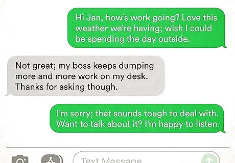 Remind the other person that there's an actual human being behind the words on that little phone screen. Add smileys, emojis, and emoticons, or use text laughs, such as "lol", "rofl", "cqts", etc., if that suits your texting style. You want your friend to see your unique texting patterns, just as no one else could sound like you if you were to have a conversation in person. Don’t worry so much about telling your friend what he or she wants to hear; it’s much more important that you let the real you shine through than putting on some kind of a front. If you’re normally a bit goofy or silly, let this come through! You want your authentic self to show through your texts.