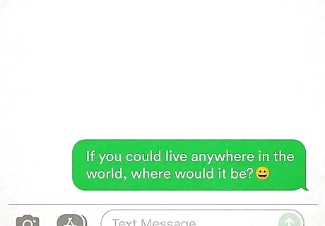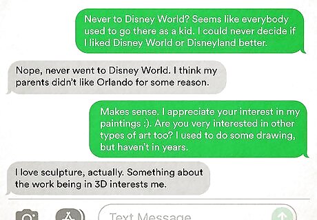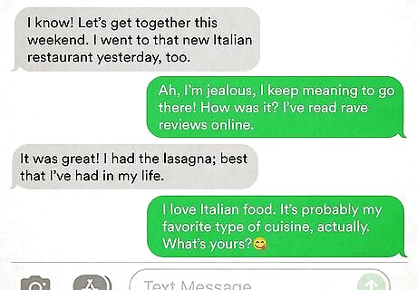 People love it when you ask for their opinion and they are always happy to give it, whether you’re in person or texting. If you show that you really care about what the person thinks, then he or she will be happy to keep talking to you. Focus more on listening to what the other person has to say than giving an opinion of your own. Try to keep your questions open-ended. Instead of asking, “Did you like the new movie?” ask, “What did you think of the new movie?” or “Why didn’t you like the concert?” This gives the person more to work with. Some examples are: "What's a controversial opinion you have?" or "What do you think about pineapples on pizza?".