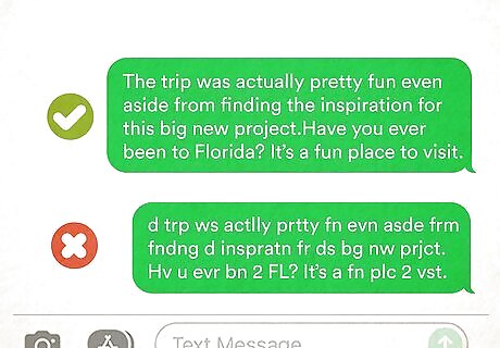 While the occasional misspelling or abbreviation is cute and acceptable, it's not fun when a person strains their eyes trying to decipher your texts. Try to keep chatspeak to a minimum, especially if you’re talking to a person you haven’t texted too often before; give people a little while to get used to your texting style before you use anything too colloquial. Plus, nothing will slow down a conversation faster than having the person you’re texting ask you for clarification or having to repeat yourself.