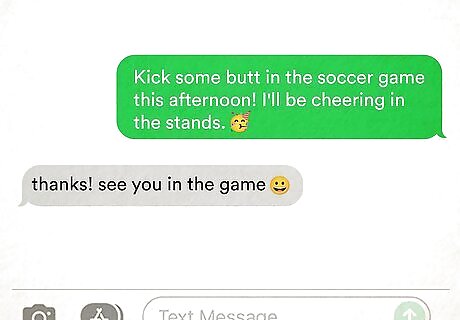 If the person you're talking to has a big test, an interview, or just another important event going on, then you can send the person a text to show that you're thinking of him or her and that you wish him or her the best. A bit of encouragement can be just the thing the person needs to succeed and to feel like you really care. Here are some ways to wish the person some good luck: "Good luck with your test tomorrow. I know you'll rock it!" "Get some rest before your interview. You're going to wow them." "Kick some butt in the soccer game this afternoon! I'll be cheering in the stands."