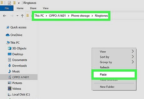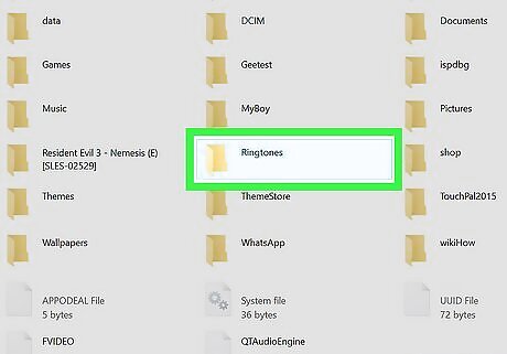 Open your Android's ringtone folder. To do so: Windows - Open Start, open the File Explorer Windows Start Explorer, click your Android's name on the left side of the window, and double-click the Ringtones folder. Mac - Open Android File Transfer, then double-click the Ringtones folder. Some Androids store the Ringtones folder deep inside of the internal storage. If you can't find Ringtones in the main window, try opening the media folder, double-clicking audio, and then looking for ringtones there.