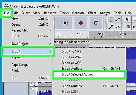 Save the selection as a ringtone. Click File, click Export Selected Audio..., click the "Save as type" drop-down box, click MP3 files in the drop-down menu, click a save location on the left side of the window, and click Save in the bottom-right corner. If you want to use your selected audio as an iPhone ringtone, add .m4r to the end of the file's name in the "File name" box, then go to the adding a ringtone to an iPhone section of this article.