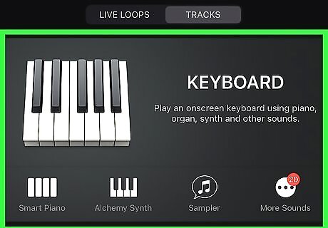 Tap the "Keyboard" option. This should show you a large picture of a keyboard. The Tracks tab should be grey and active, if not, tap it. If you don't see the different options or can't swipe left or right to see the different instruments, tap + first to create a new project.