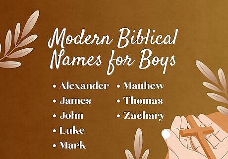 Choose a Biblical name that sounds modern, like Luke, Mark, or Zach. If you're looking for a Biblical boy name that sounds right at home in modern times, consider choosing a name from the New Testament. Not only are names from the New Testament closer to our time in history than the classic Old Testament names, but many people don't even associate them with the Bible. You might, for example, associate the name "Luke" more with Luke Skywalker from Star Wars than with Luke, Jesus's faithful disciple! Here are some other popular contemporary-sounding Biblical boy names to try. Alexander: "Man's defender"; "warrior" James: "Supplanter"; "holder of the heel" John: "God is gracious" Luke: "From Lucania" Mark: "Dedicated to Mars" Matthew: "Gift of God" Thomas: "Twin" Zachary: "The Lord recalled"