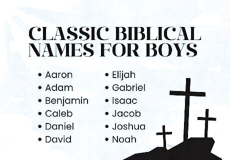 Opt for traditional Biblical names like Abraham, Isaac, or Joshua. When parents choose a name from the Bible for their son, they often opt for one of many classics you've probably heard over and over. These names are usually popular because they belong to an important Biblical figure, like Abraham, the forefather of the Hebrews, or Joshua, the hero who helped bring down the walls of Jericho. Some people choose a classic Bible name for its association with a specific hero, while others simply like its meaning or how it sounds. No matter your reason, you can't go wrong with one of the classic Biblical boy names below. Aaron: "Mountain of strength"; "exalted"; "strong"; "warrior lion" Abraham: "High father"; "father of multitudes"; "father of nations" Adam: "Son of red earth" Benjamin: "Son of the right hand"; "son of the south"; "son of my days" Caleb: "Whole-hearted"; "dog-like" Daniel: "God is my judge" David: "Beloved" Elijah: "The Lord is my God" Gabriel: "Man of God" Isaac: "One who laughs or rejoices" Jacob: "Supplanter" Joshua: "Yahweh is salvation" Noah: "Peaceful" Samuel: "God has heard; name of God" Feeling confident in how much you know about the holy scriptures? Test your knowledge with our "How Well Do I Know the Bible?" quiz!