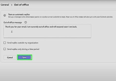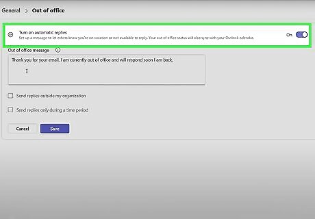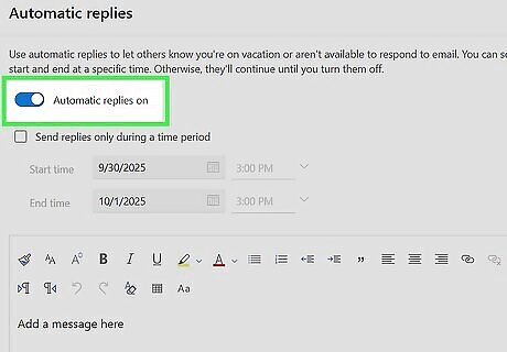 Enable automatic replies. Toggle on the switch next to Turn on automatic replies. This option will cause anyone who messages you during this time to get an automatic reply with whatever out of office message you set. Outlook will also send automatic replies with your out of office message. To schedule automatic replies for a specific timeframe, check the box next to Send replies only during a time period. Use the boxes below to set a specific start and end date/time. You can also check the box next to Send replies outside my organization if you want people other than your coworkers/classmates to get automatic out of office replies.