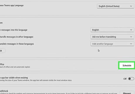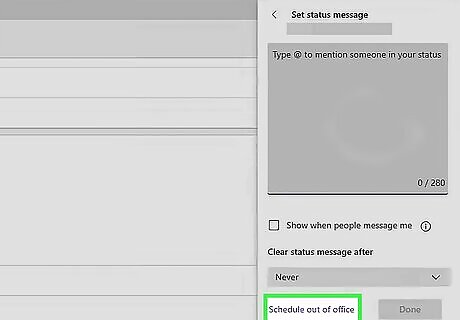 Click Schedule. It’s near the bottom of the menu under the Out of Office header. You won’t see an Out of Office section of the menu if you don’t have a work or school account. You can still set a status message explaining that you’re out of office by clicking your profile picture and selecting Set status message. You can also set this message to expire after a certain amount of time.