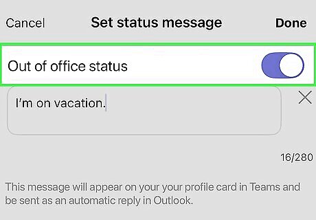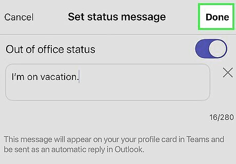 Tap Done. It’s at the top right corner of the screen. If you set a time range for your status, it should expire once that time elapses. To turn off your out of office status before then, return to the Out of office menu and toggle off Set automatic reply.