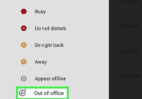 Select Out of office. Note that if you don’t have a Microsoft school or work account, you won’t see this option. However, you can choose an option like Be right back or Away instead. Another option if you don’t have a school or work account is to tap Set status message (just below your current status in the menu), then enter a message explaining that you are out of the office. Tap Clear after to set an automatic expiration time for your status message.