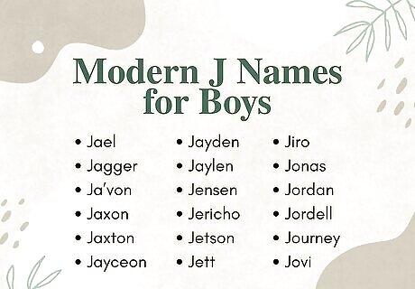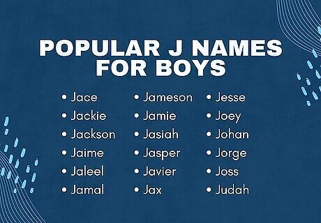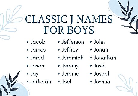 Pick a timeless name that won’t go out of style. Classic names are classic for a reason; they withstand the test of time! If unique, modern names aren’t really your thing, go for a vintage name that’s still popular today. Here are some examples: Jacob (Hebrew for “supplanter, to follow”) James (Hebrew for “supplanter, holder of the heel”) Jared (Hebrew for “descending, descent”) Jason (Hebrew and Greek for “healer”) Jay (English for “blue-crested bird”) Jedidiah (Hebrew for “beloved of the Lord”) Jefferson (English for “son of Jeffrey”) Jeffrey (German and English for “pledge of peace, God’s peace”) Jeremiah (Hebrew for “Yah will exalt”) Jeremy (Hebrew for “God will uplift”) Jerome (Greek for “sacred name”) Joel (Hebrew for “Jehovah is the Lord”) John (Hebrew for “God is gracious”) Jonah (Hebrew for “dove”) Jonathan (Hebrew for “gift of God”) José (Spanish and Portuguese for “God multiplies”) Joseph (Hebrew for “God shall add”) Joshua (Hebrew for “Yahweh is salvation”) Juan (Spanish for “God is gracious”) Junior (Latin and English for “younger one”)