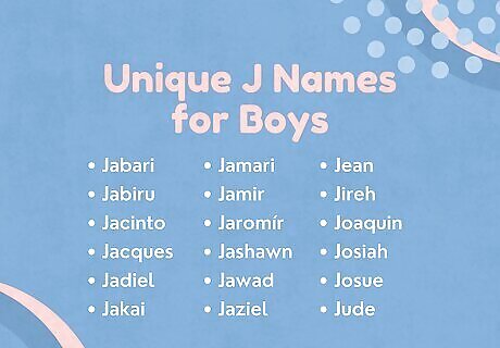 Stand out from the crowd with a unique name. Many cultures around the world have popular J names, so if you’re tired of hearing the common options in your area, look to other places around the globe. If you want something really unique, come up with a new version of an existing name. Here are some examples: Jabari (Arabic for “almighty”) Jabiru (Brazilian for “swollen neck,” a type of bird) Jacinto (Spanish and Portuguese for “hyacinth”) Jacques (French for “supplanter”) Jadiel (Hebrew for “God has heard, praise of God”) Jakai (American for “God is gracious”) Jamari (Arabic for “beauty”) Jamir (Arabic for “handsome, beautiful”) Jaromír (Slavic for “one who fiercely defends peace”) Jashawn (American for “God is gracious”) Jawad (Arabic for “generous”) Jaziel (Hebrew for “God apportions”) Jean (French for “God is gracious”) Jireh (Hebrew for “the Lord will provide”) Joaquin (Spanish for “established by God”) Josiah (Hebrew for “Yahweh supports”) Josue (Haitian for “God is salvation”) Jude (Hebrew for “praised”) Julian (Greek for “youthful, Jove’s child”) Julius (Latin and Greek for “devoted to Jove”)