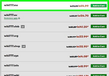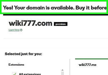 Search for the domain name you want to register. Registration sites typically have a search field on their home page. If the domain name isn't available, try an alternative. Sometimes the name won't be available for one type of domain, such as .com, but it may be available with a .net, .biz, or .co, for example. Certain suffixes are only available for certain types of organizations: .edu is reserved for educational institutions; .org is used for nonprofits, and .gov or .us are used for government sites. Some services like GoDaddy let you put in a backorder request if a domain name is already taken. If the domain doesn't get renewed by its current owner, you can bid for it.