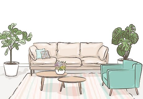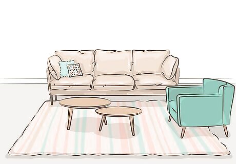 A rug ties all your furniture together and makes the room look bigger. Choose a rug that occupies most of the middle of the room. Lay it down in the center of the room so that at least 2 legs of your couch or chairs are on it. You can use a rug with a bold color or pattern as a statement piece in a room with lots of neutral colors and patterns.