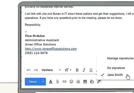 Conclude your email with a sign-off and signature. To keep your email professional, end it with another thank you to your reader or a formal goodbye such as “Thank you for your consideration” or “I look forward to hearing from you.” Then, include a signature listing your name, job title, relevant contact information, and professional websites or social media. Don’t bog down your signature with unnecessary details, quotes, or graphics. Avoid casual closings like “Cheers” unless you are good friends with the reader, as these types of closings are less professional. Ensure your signature offers the recipient all of the information they need about who you are so you don’t have to introduce yourself at length within the message. To save yourself some trouble, save a custom signature in the email platform you use so that it will be displayed automatically in future messages. Providing links to your social media accounts like LinkedIn will give unfamiliar contacts a more complete picture of you. Career expert Shannon O’Brien says one way to make your email sign-off stand out is to use positive language, especially when applying for a job and attaching a resumé. “Something I’ve used a lot,” she says, “is ‘Please see my attached resumé’ followed by ‘Thanks’ or ‘Much appreciation.’”