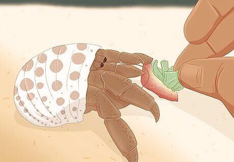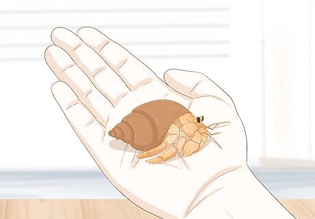 Handle your hermies with extreme care and patience. Hermit crabs normally get kind of twitchy when you touch them, so go slow. When you get your hermit crabs, leave them in the tank for a few days. Once your crabs don’t shy away from you, try putting your hand down near them to see if they’re interested. Let your hermit crab explore your hand and get used to you. Once you get them home, they go through a “de-stressing” period that can take as little as a few days and as long as two months. During this time, change out their food and water regularly and do not disturb them. Your crabs probably won’t like being held, but many hermit crabs will learn to tolerate handling if you go slow and you don’t make a lot of sudden movements.