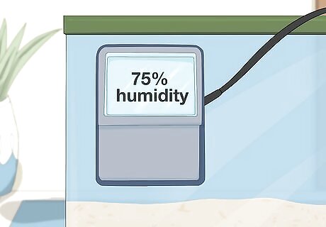 Maintain a humidity of roughly 75% at all times. Get a a hygrometer (humidity gauge) and stick it in the crabs’ habitat to track the humidity. Whenever the humidity gets too low, mist their cage with a little water. Hermit crabs breathe through hardened gills, and can't breathe properly unless the air is humid enough, so keep them moist at all times. A great way to increase your tank's humidity naturally is to add natural moss to your tank. It increases the humidity, and hermit crabs love to snack on it it. Damp crab sponges are also a great way to keep the humidity high in a hermit crab tank.