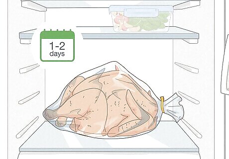 Store raw chicken in the fridge for 1-2 days. According to FoodSafety.gov, you can safely store raw whole chicken or chicken pieces (i.e., breasts, wings, drumsticks, etc.) in your refrigerator for 1-2 days. You can either cook it within that time or move it to the freezer. After 1-2 days, the chicken will begin to spoil and is no longer safe to eat, so throw it away.