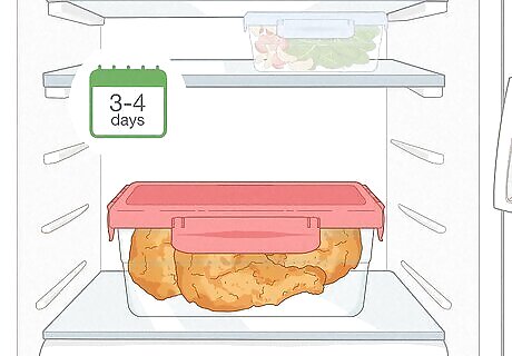 Store cooked chicken in the fridge for 3-4 days. Don't throw away your leftover chicken dishes! Instead, store them in an airtight container and place them in the fridge for up to 3-4 days. Eat it or freeze it within that time, or pop it in the freezer to reheat in the coming weeks or months. The 3-4 day time frame applies to all cooked chicken, including: grilled, boiled, fried chicken; rotisserie chicken; and chicken patties and nuggets.