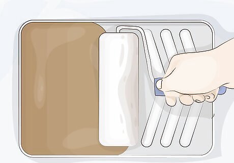 Dip a paint roller into the oil. A ⁄8 in (0.95 cm) nap roller is an appropriate choice for most decks. You can also use a paint brush, stain brush, or staining pad. However, rollers are the easiest way to quickly and evenly coat large areas. If you need to, pour the oil into a tray so you can coat the roller with oil. You can also use a spray gun. Be aware though that you will need to go over the wood with a paint roller to smooth out the coating.