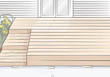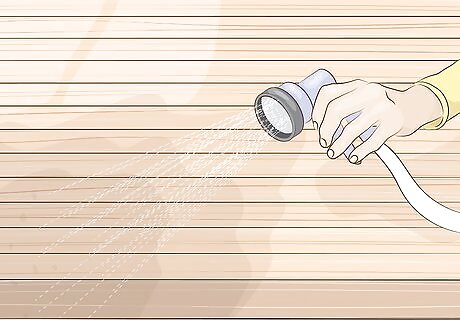 Rinse off the deck with a hose. Spray off all the dirt and debris. You want the wood to be free of anything that can interfere with the finish. This includes leaves, twigs, and mold. Make sure you get any dirt stuck between boards.