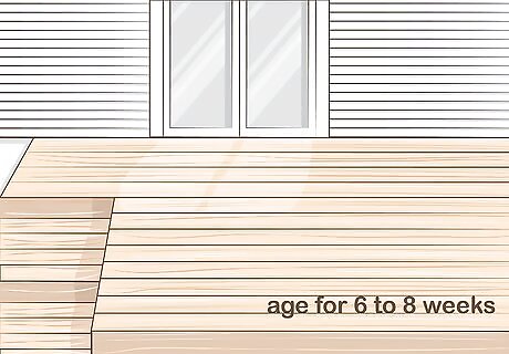 Age new wood for 6 to 8 weeks before applying the oil. The manufacturer recommends that you let new wood age for at least 6 weeks before you apply ipe oil. This happens naturally as your deck is exposed to the elements. For previously stained or treated decks, the oil can be applied right away.