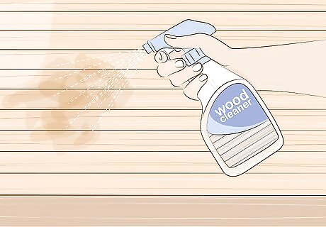 Use a wood cleaner to remove tough stains. If you notice any damaged spots, particularly from mold, mildew, or algae, try a wood cleaner. Visit a home improvement store to choose a product designed for wood or decks. All you have to do is spread it over the wood directly from the bottle, then rinse it off after about 10 minutes. You may want to choose a biodegradable cleaner, especially if you are cleaning a deck near a lawn or garden. You can also try making your own wood cleaner out of 2 US gal (7.6 L) of warm water, 16 fl oz (470 mL) of powdered oxygen bleach, and 2 fl oz (59 mL) of liquid detergent.