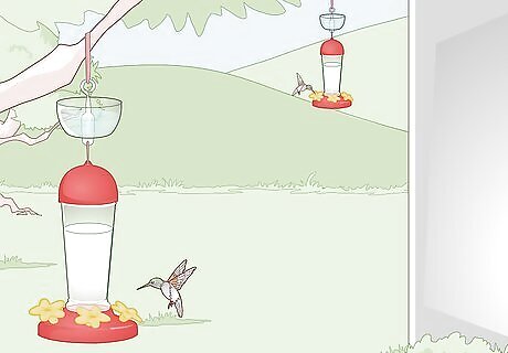 Use multiple feeders to attract more hummingbirds. The more opportunities you give the hummingbirds to eat, the more likely it is they’ll flock to the buffet of feeders. If you only have 1 feeder, add 1 to 3 more to encourage more hummingbirds to stop by. Adding another feeder will also help topple the reign of any dominant male hummingbirds in the area. If you have a dominant male that’s bullying other hummingbirds away from the feeder, place 2 or 3 more feeders within view of the existing feeder. That way, more hummingbirds can come and outnumber the dominant male.