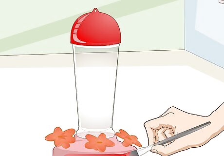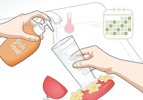 Clean the feeder every 2 to 3 days with warm water and mild dish soap. Scrub the feeder with a bottle brush to reach every nook and cranny. Hummingbirds dip their tongues into the water as they drink, which can spread pathogens that can make them sick. A good rule of thumb: clean the feeder as you would your own drinking glass. Hummingbirds will typically eat up all the nectar within 4 to 5 days, but if you notice any leftover nectar, go ahead and clean the feeder before refilling it (don’t just top it off!). Hot weather can evaporate the sugar-water faster, so check the feeder every day if it’s over 90°F (32°C) to see if you need to clean and refill it. If you notice the sugar-water is cloudy or growing mold, wash the feeder right away.