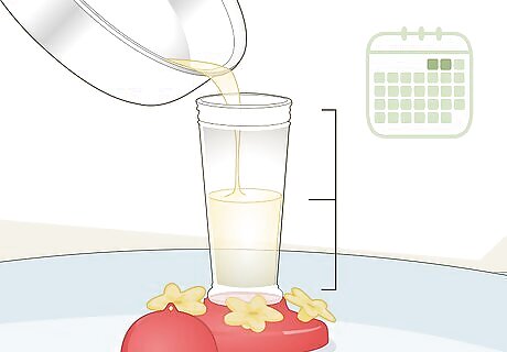 Fill the feeder about halfway full to provide enough nectar for 1 or 2 days. There’s no need to fill the feeder to the top, especially if you’re not sure how many hummingbirds your feeder will attract. If you notice the nectar is gone in 1 day due to lots of visitors, fill it about 3/4 of the way full. Most feeders hold anywhere from 8 fluid ounces (240 mL) to 12 fluid ounces (350 mL) of liquid but you can find reservoir feeders that hold up to 32 fluid ounces (950 mL).