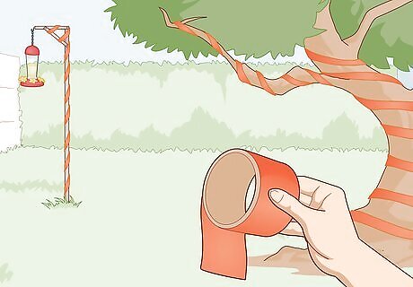Wrap red or orange plastic ribbon around something near the feeder. Purchase bright red or orange surveyor’s tape from any hardware store and cut it into 12 in (30 cm) pieces so you can tie it around tree trunks, railings, or anywhere near the feeder. The bright color will pique the interest of high-flying hummingbirds, enticing them to stop and check out your feeder and flowering gardens. Surveyor’s tape is also called flagging tape and can cost anywhere from $1.50 to $6.00.