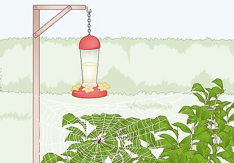 Let spiders keep their webs near the feeder. Hummingbirds use spiderweb silk to secure their nests, so the more webs you have around, the more likely it is that you'll have some quick-winged visitors. They also love to steal the spiders' dinners—the insects are a great source of protein! However, orb-weaver spiders eat hummingbirds, so if you notice this type of spider setting up a home near the feeder, go ahead and get rid of the web.
