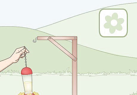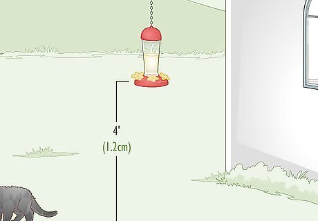 Hang the feeder at least 4 feet (1.2 m) off the ground to keep pests away. Cats, opossums, squirrels, and other pests might be drawn to the sugar-water, so hang the feeder high enough off the ground so they can’t get to it. Cats can be ninjas, so make sure there are no places where cats can leap from to reach the feeder. Make sure there’s no foliage underneath the feeder because sugar-water may drip down onto the leaves and attract pests.