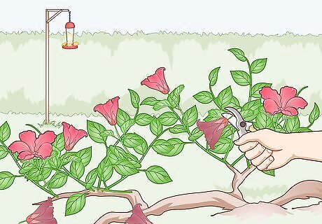 Deadhead the flowers in your garden to encourage more blooms. The more blooms you have, the more likely it is that hummingbirds will come! Deadheading means removing old, wilted blossoms and seed heads (the dried flowering or fruiting part) from plants that are currently blooming. In a way, this tricks the plant into thinking it's not done blooming yet. This is most effective if your feeder is placed near the flowers or within viewing range.