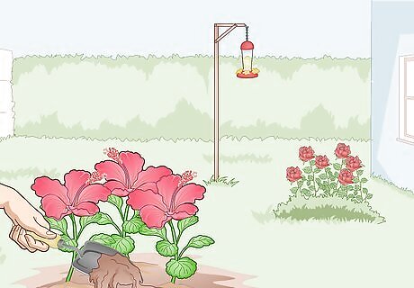 Plant plenty of flowers that have red blooms near your feeder. When hummingbirds see bright red blooms, they think they're in for a tasty treat! Daylily, columbine, cardinal flowers, penstemon, bee balm, hibiscus, peonies, and oriental poppy are all vibrant flowers that hummingbirds will love. Hummingbirds see ultraviolet light, so all colors—red especially—appear much more vivid to them than it does to us. Be sure to look up your planting zone for particular flowers.