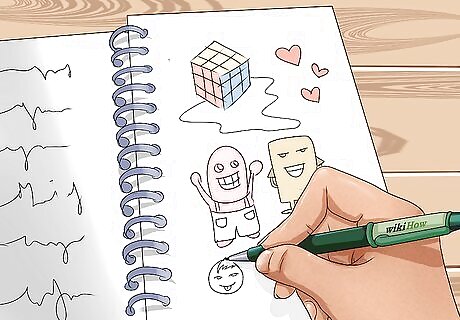Move your hand constantly. Even if you’ve gotten enough sleep, staying awake for an entire class can be challenging since many classrooms are uncomfortable and lack visual stimulation. They might be too hot or too cold, have dull wall colors, and/or lack art on the walls. However, taking notes can help you fight that sleepy feeling. The physical motion of taking notes keeps the blood circulating, which helps your brain stay on task. If the teacher pauses or fusses with the overhead projector for long periods, keep that hand moving by creating a to-do list. Feel free to doodle (draw animals, shapes, logos, etc). Doodling isn't distracting; in fact, it usually aids brain processes and helps students become interested in the course content.