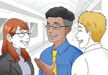 Exhibit approachable body language. Standing against a wall at an event with your arms crossed and a pout on your face will only cause others to carefully maneuver around you. They will automatically think you are unlikable based on your body language. Welcoming others and helping them to open up around you means changing your body language to send off positive signals. In addition to a friendly smile, approachable body language involves sitting with an erect posture, holding your head high with arms uncrossed and open at your sides. You should also maintain steady eye contact with the other person - but, make sure to blink and look away on occasion, so as not to intimidate the other person with a constant stare.