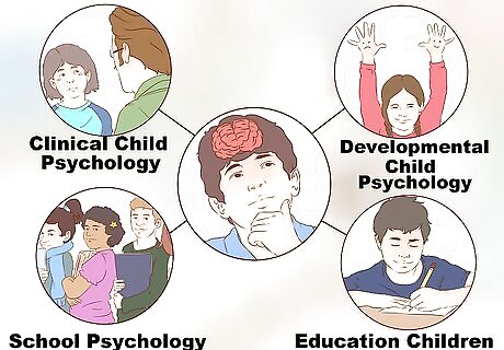 Determine what field of child psychology you want to work in. Once you obtain your bachelor's degree, you'll need a PhD to work as a child psychologist in the majority of circumstances. During your Ph.D. program, you'll have to concentrate on one of the four fields of child psychology which include clinical, developmental, school, and educational psychology. Determine which type of job you would want post-graduation and specialize in it. Clinical child psychologists deal directly with the children and help assess, diagnose, and treat children with developmental or psychological disorders, as well as do scientific and academic research in these areas. Developmental child psychologists work more towards a better understanding of child behavior in a research-based setting. School psychologists deal with the mental health needs of children in a school or education setting. They determine child eligibility for government sponsored programs and help build curricula to suit the needs of children. Education children psychologists work to improve the learning and teaching processes in schools. They suggest changes to classes and curriculum, so it can better suit the needs of children's psychological health.