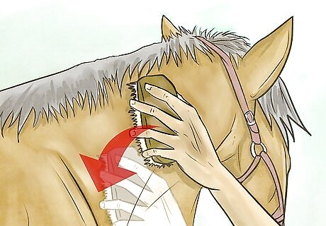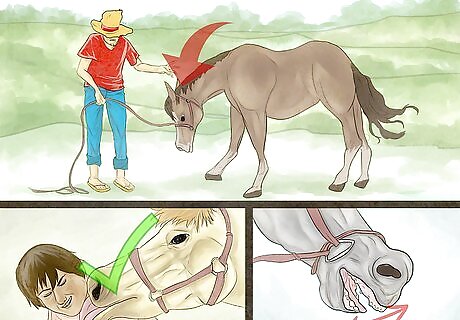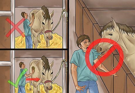 Teach your horse that you are the leader. Horses read body language and use physical language as well to express themselves. Horses will also read your body language to determine whether or not you are in charge. Little things like crowding your space or chewing on your shirt can indicate that a horse does not see you as a leader. It is important to teach your horse that you are in charge. You can use gentle pressure to correct a horse if he is in your personal space. For example, if your horse encroaches on your space when you are brushing him, then lean into his side until he moves back to where he was standing before.