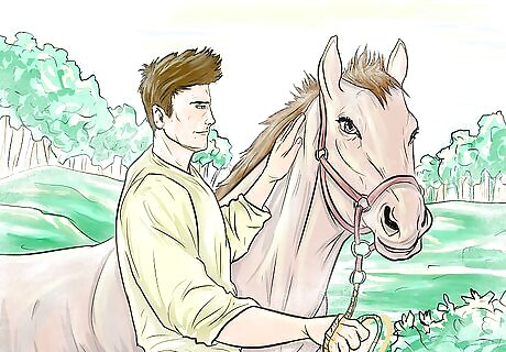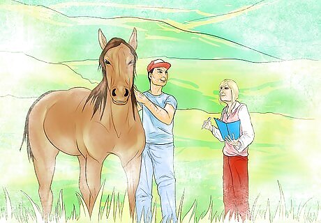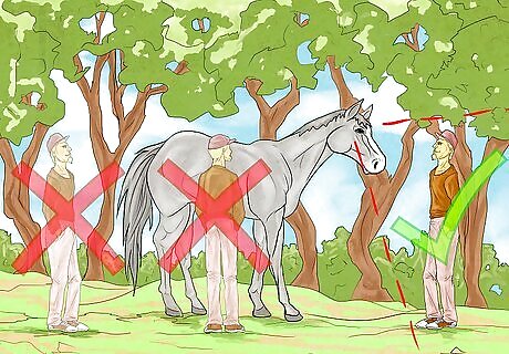 Spend time around horses. Remember that a hyperactive horse or a wild horse can be dangerous. Do not get too close to the horse before it is comfortable with your presence - doing so could ruin the trust you have already earned and may put your safety in jeopardy. Do not attempt to calm a frightened horse if you have not been properly trained to do so. Be careful when approaching horses, as they can be skittish when approached from the behind. Remember that though their hind legs can be dangerous, their front legs are more so. Observe horses while they are in their paddock. Stand with the horse and talk to him, gently. See how the horse interacts with other humans and horses.