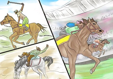 Take up a sport with horses. There are many horse related sports. Polo, racing, rodeos, and trick competitions are all competitive ways to get involved with horses. Sometimes schools, such as colleges, will have these clubs or groups. In other cases, it may take some research online to find a local group that plays sports with horses.