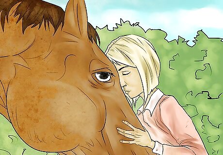 Groom and pet horses. Get a horse grooming kit and take good care of it. Gently slide your hand down your horse's body to let him know that he can trust you. This action is a crucial part of understanding and developing strong bonds with horses. It should be a habit. After the horse has been mildly tamed enough to let you pet and groom him, don't expect to just hop right on and ride. You will need to get the horse to trust you first. Make sure to clean up after the horse as well. This is so you have a full understanding of the animal.