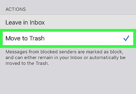Tap Move to Trash. A blue checkmark will appear beside it. As long as this option is selected, messages from blocked senders will automatically be placed into the Mail app's Trash folder. If you block additional senders, their messages will also be routed to the Trash. You can still read messages from blocked senders if you wish. Just launch the Mail app, tap the Trash folder, and then tap the message. Blocked messages will remain in the Trash for 30 days before they are permanently deleted.