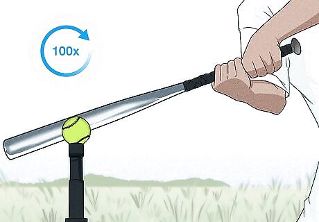 Take 100 swings from a tee. Using the correct form, hit about 100 balls from a tee. You'll be hitting the ball at about half of your normal power. These first 100 swings at half power will begin the work of gradually breaking in your bat. To make the process go faster, have someone help you by setting up new balls on the tee before every swing. You can take more than 100 swings if you desire. However, don't do less than 100, since the bat needs to be broken in gradually. Moving to a full-speed swing too quickly could damage the bat. Instead of randomly hitting with different parts of the bat, try to line up the bat so the brand name is facing you. After you've done some reps with this setup, switch sides The more you hit the bat in 1 spot, the quicker it will break.
